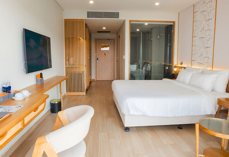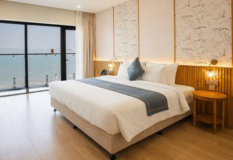 Phòng nghỉ khách sạn với thiết kế sang trọng, nội thất tiện nghi, tầm nhìn hướng biển.